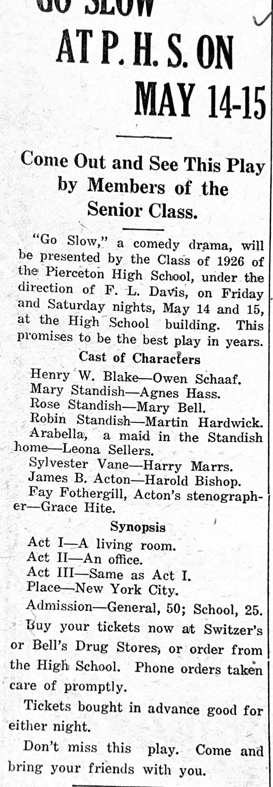 The Senior Class of 1926 presented the comedy drama Go Slow on Friday and Saturday nights, May 14 and 15 under the direction of Professor F. L. Davis. Tickets ($0.50 adults/$0.25 students) were sold at Switzer’s or Bell’s Drug Stores.