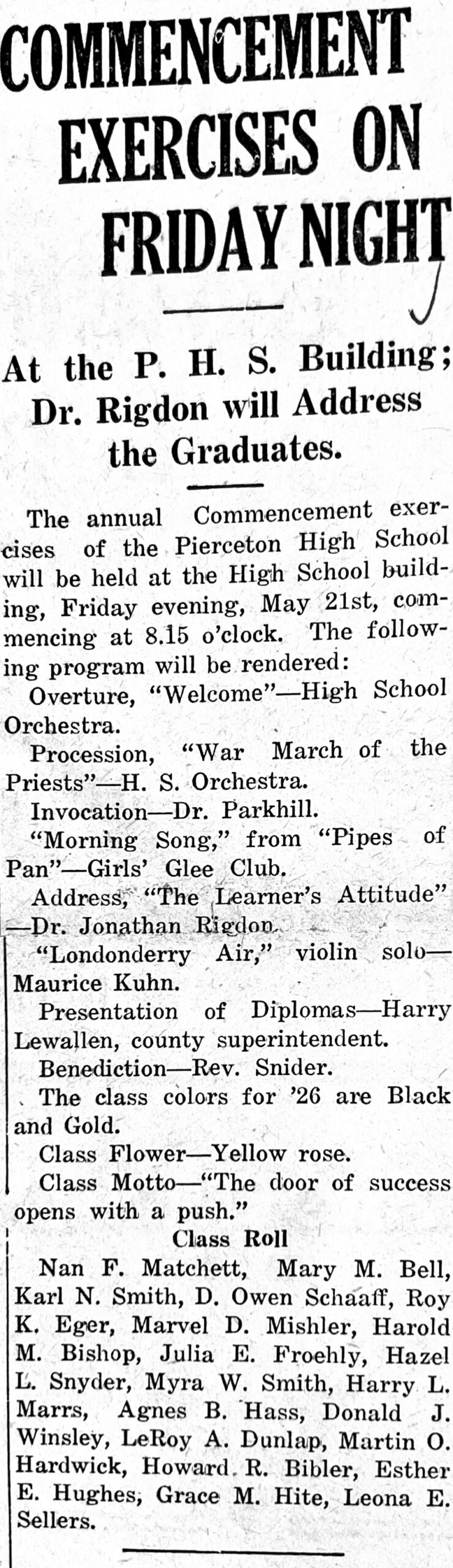 With no time to recover from the reception and meal, nineteen seniors of the Class of 1926 attended a dignified, but joyful, Commencement exercises on Friday, May 21, at the high school building. After the Invocation by Rev. Parkhill, pastor of the Presbyterian Church, Dr. Jonathon Rigdon of Winona Lake, gave an address entitled The Learner’s Attitude.”