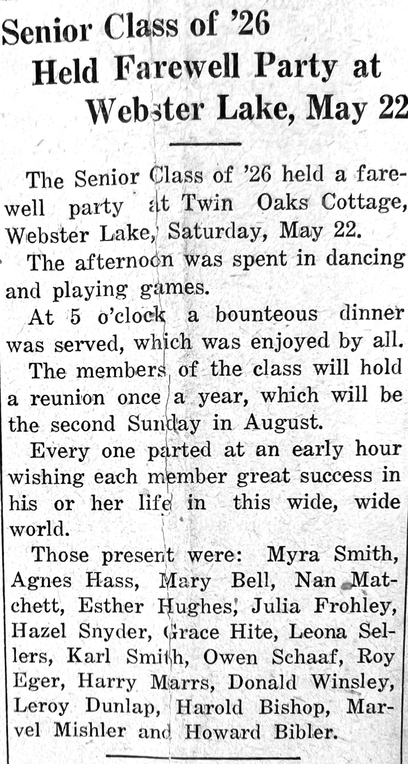 On Saturday, May 22, the class held a farewell party at Twin Oaks Cottage on Webster Lake. Eighteen of the graduating seniors spent the day dancing and playing games before enjoying a “bounteous meal” at 5:00 that evening. They left wishing each other great success in life, but not before committing to holding a class reunion every year on the second Sunday in August.