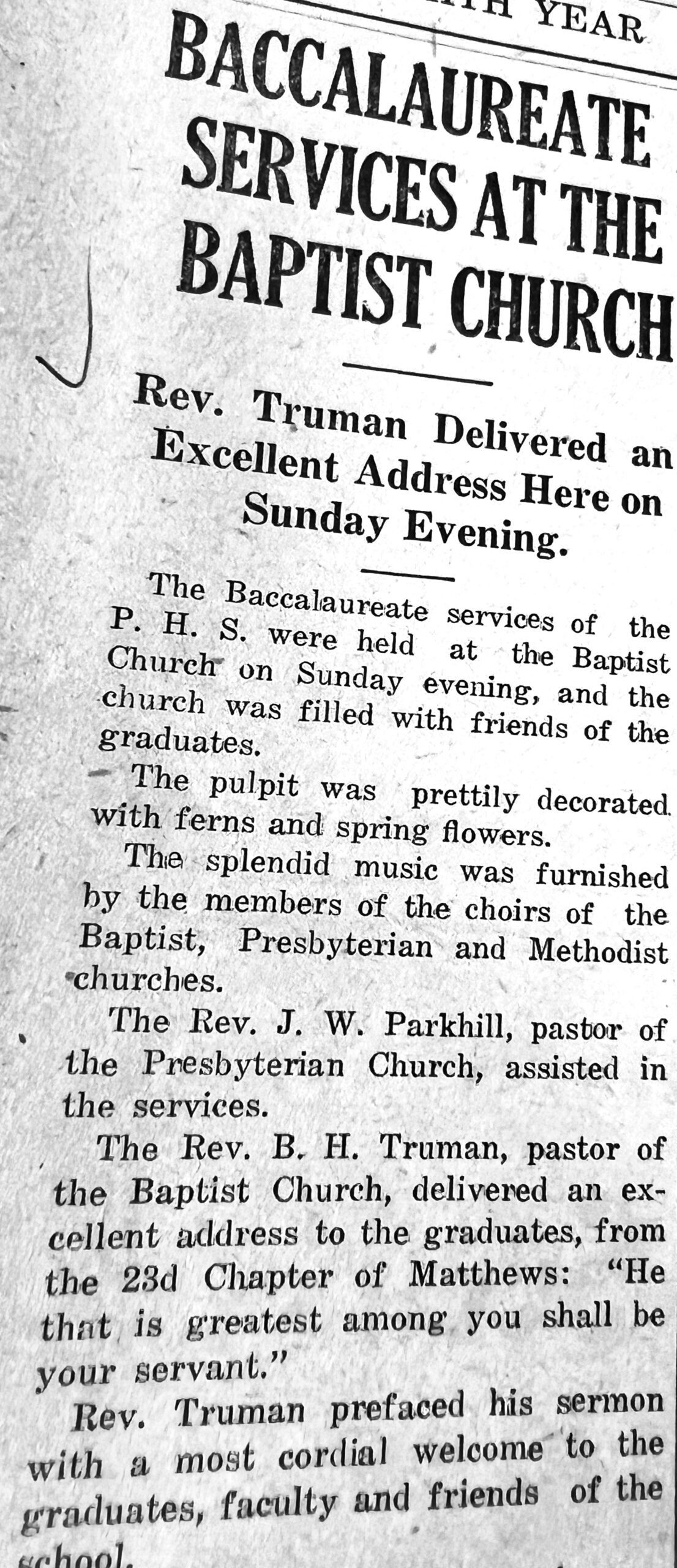 The following evening, Sunday, May 23, class members and their families attended the Baccalaureate service at the Baptist Church. Following music by the combined choirs of the Baptist, Methodist, and Presbyterian Churches, the Reverend B. H. Truman, pastor of the Baptist Church delivered an address based on Mathew 23: “He that is greatest among you shall be your servant.” Rev. Truman stressed that the “three greatest things in life were: True friendship, our Country, and God.” He emphasized that greatness comes from serving others.
